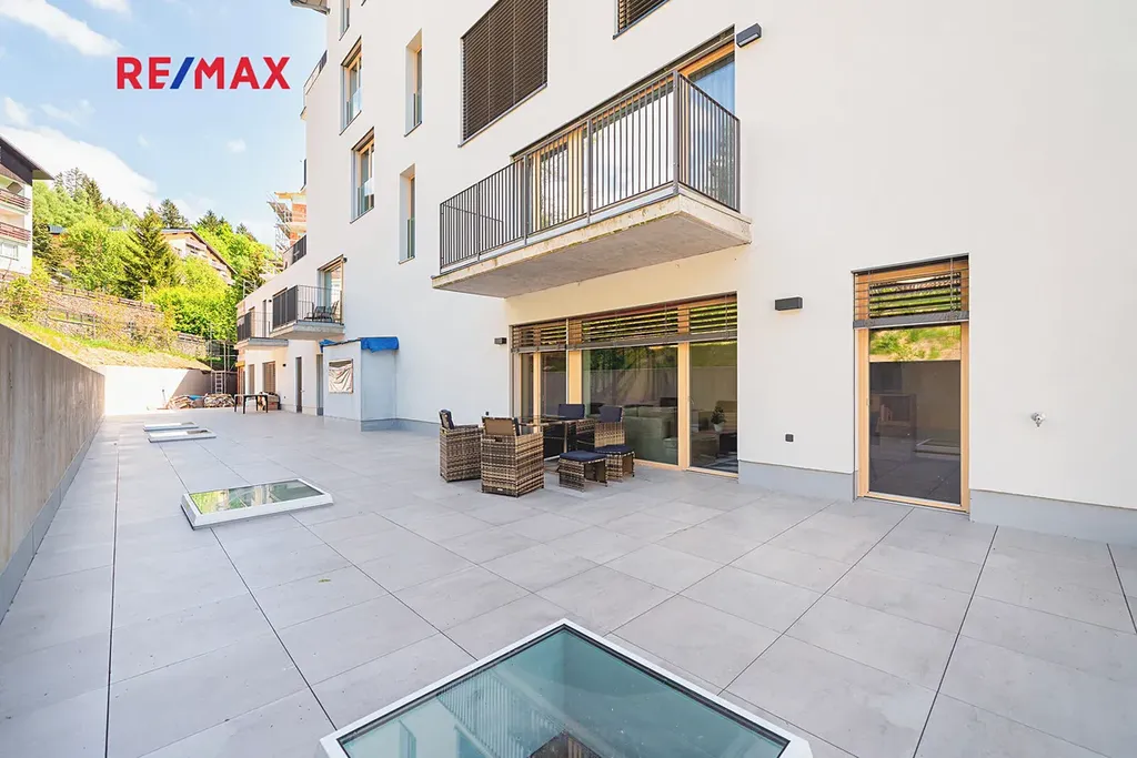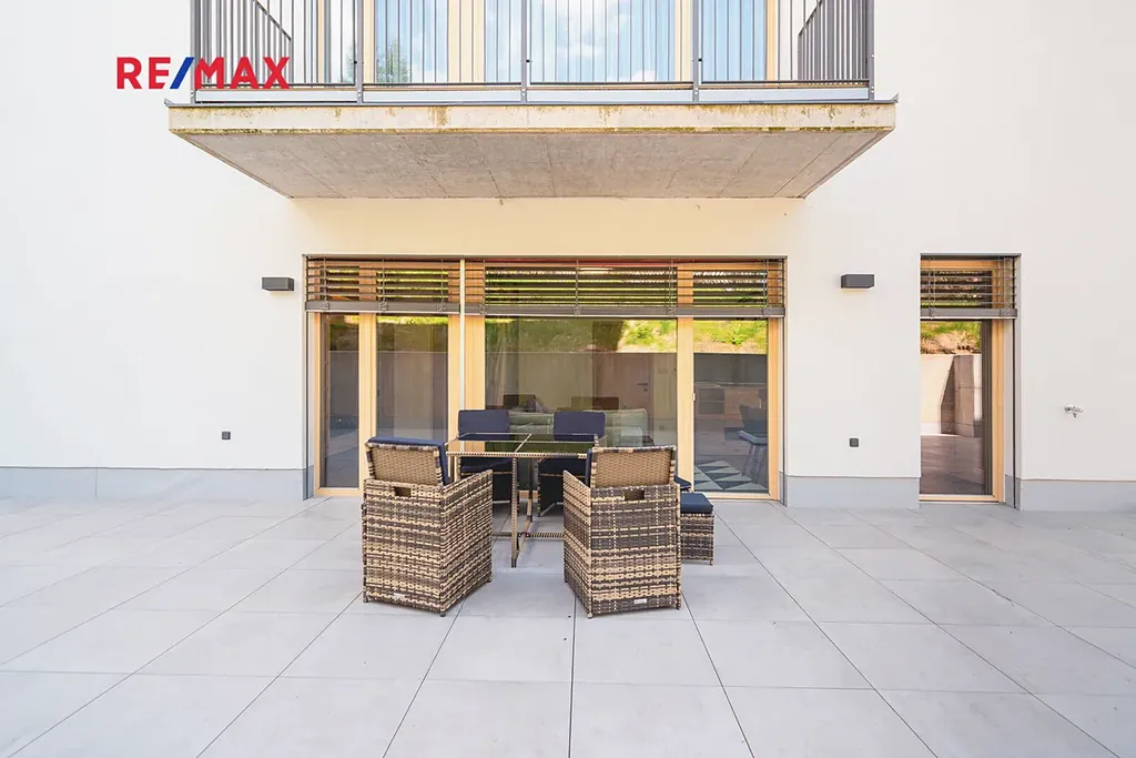 Srdcem apartmánu je obývací pokoj s kuchyňským koutem a plně vybavenou kuchyňskou linkou, který je francouzským oknem propojen s velkorysou terasou o velikosti 76 m2.