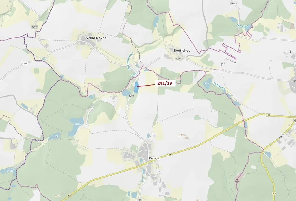 Lesní pozemek o výměře 17 171 m2, parcelní číslo 241/19, podíl 1/1, katastrální území Cetoraz, obec Cetoraz, obec s rozšířenou působností Pacov, okres Pelhřimov, Kraj Vysočina. Po těžbě.