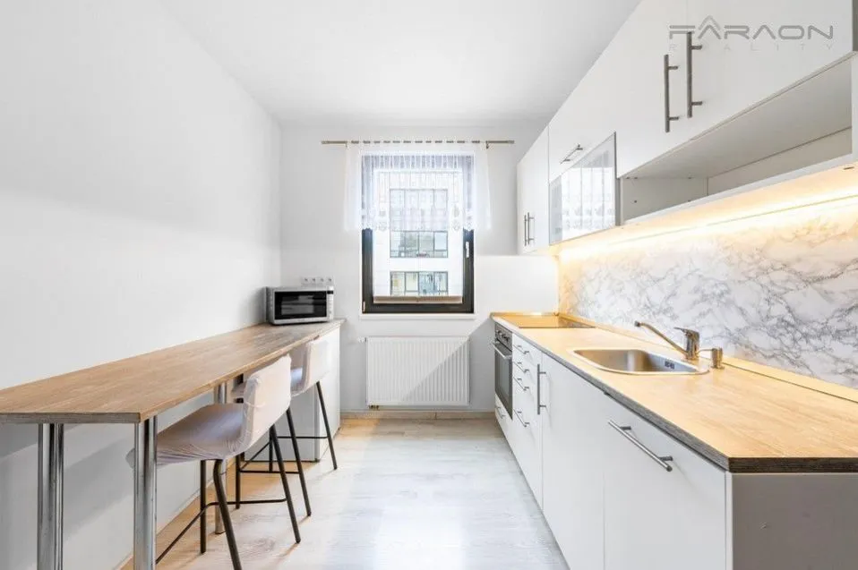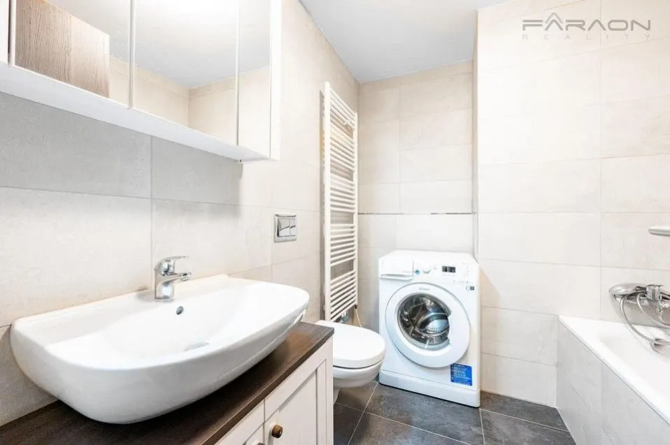 Celkové vybavení zahrnuje vybavenou kuchyňskou linku v bílém designu, lednici, elektrickou a mikrovlnnou troubu, sklokeramickou desku, myčku, termo zatemňovací plissé rolety, pračku, dostatek úložných prostor včetně věstavěné skříně v hlavní místnosti. Dále parkování v uzavřeném areálu a sklep. K dispozici zimní zahrada i kočárkárna.