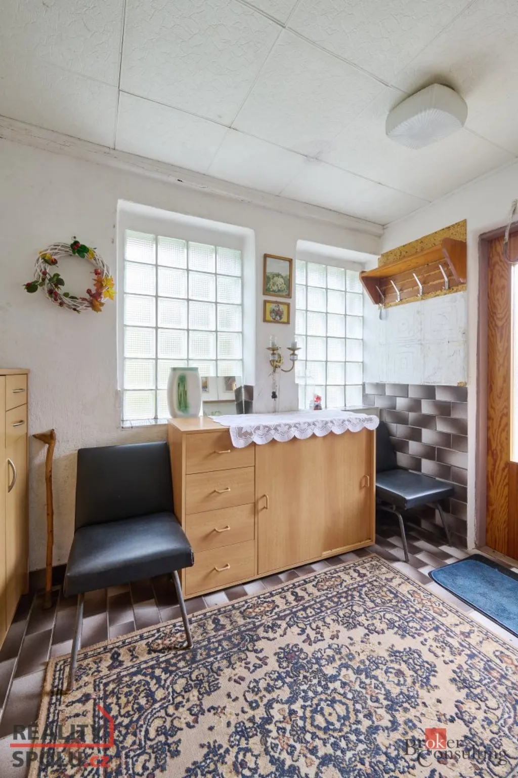 vstupní chodba, kuchyň s obývacím pokojem, spíž, koupelna, WC, ložnice, přes chodbu pak další místnost (druhá kuchyň včetně pece) a zadním vchodem na zahradu