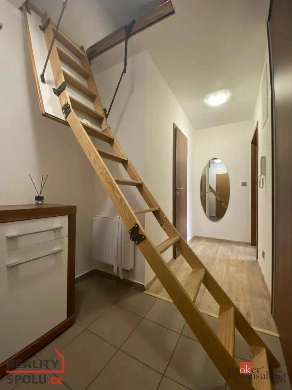 Velkou výhodou bytu je praktický úložný prostor v chodbě řešený výsuvnými půdními schody. Tento prostor je ideální pro sezónní věci, kufry či další vybavení domácnosti.