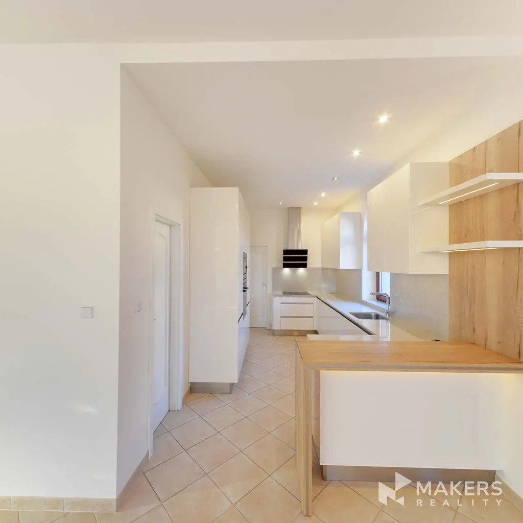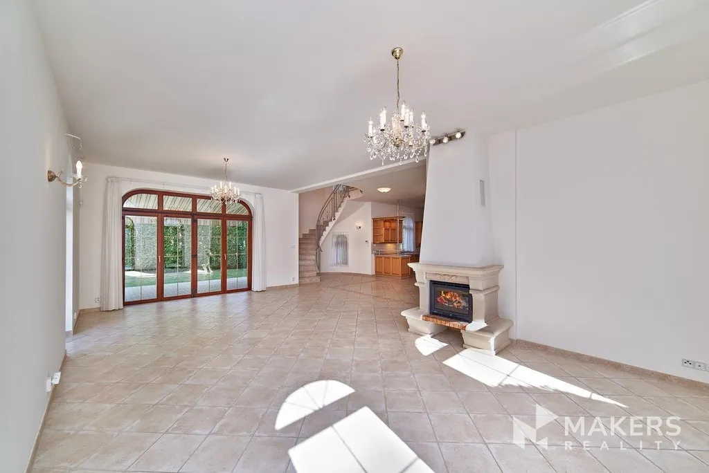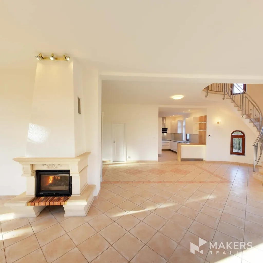 Plně zařízená kuchyně je vybavena sklokeramickou varnou deskou, horkovzdušnou troubou, myčkou, lednicí s mrazákem a digestoří. Otevřený koncept propojuje kuchyň s prostorným obývacím pokojem, jehož dominantou je krb a přímý vstup na zahradu.