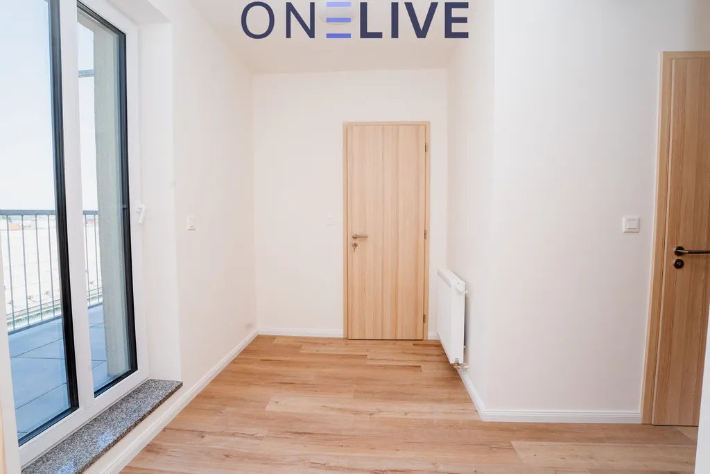 Po vstupu do zádveří se po pravé straně nachází koupelna s toaletou, sprchovým koutem, umyvadlem a závěsným topením. Z předsíně můžeme dále vstoupit do kuchyně, která je vybavena kuchyňskou linkou se spotřebiči, tzn. mikrovlnnou troubou, digestoří, varnou deskou, lednicí s mrazákem, myčkou a pračkou. Kuchyně je propojena se vzdušným, prosvětleným obývacím pokojem. Dále jsou zde dva samostatné neprůchozí pokoje, z nichž je vybaven novou manželskou postelí a má vstup na terasu. Druhá terasa je přístupná z předsíně.