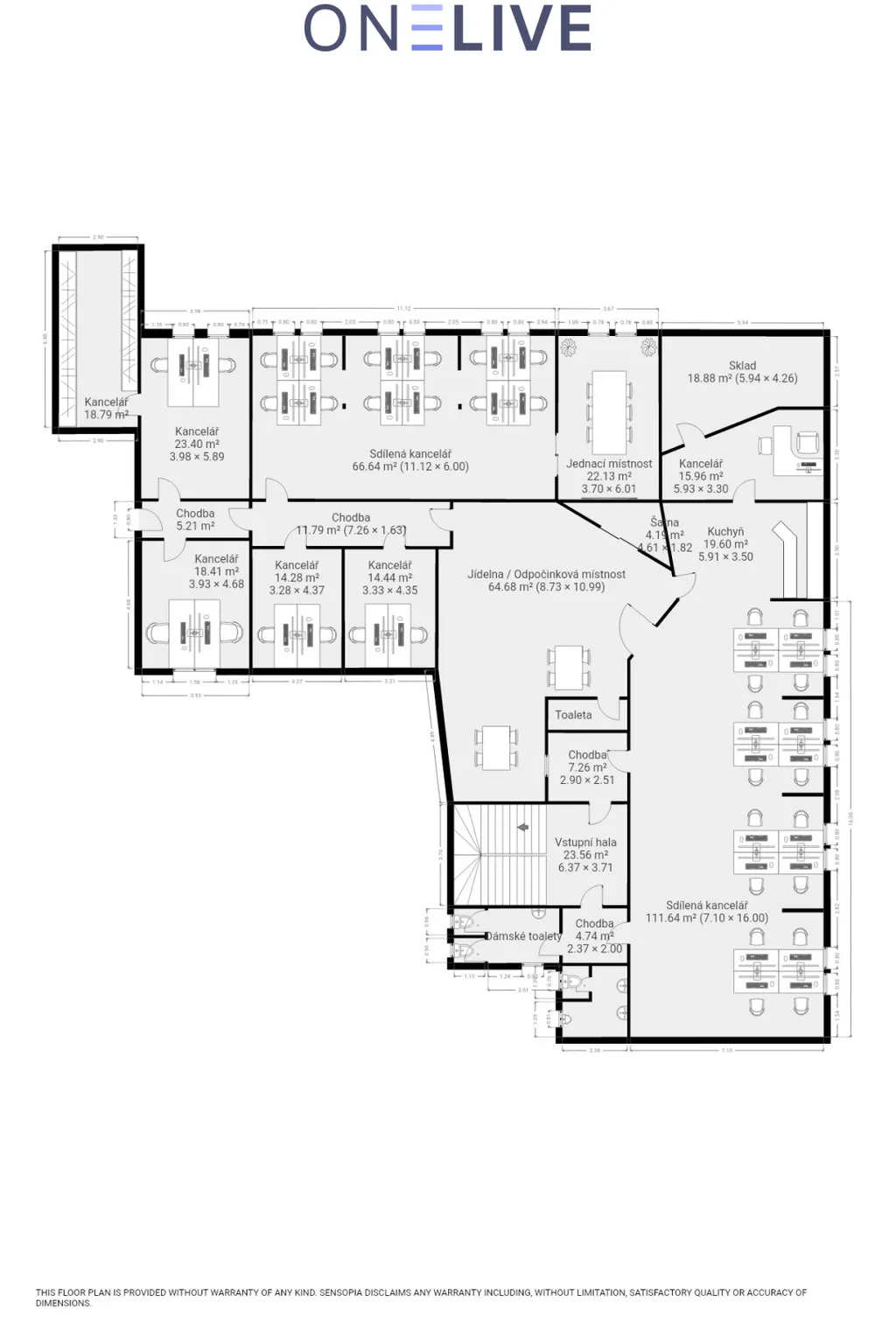 Prostory se nachází v nejvyšším patře budovy, jsou klimatizované a jsou členěny do několika samostatných kanceláří, dvou velkorysých sdílených open space prostorů, zasedací místnosti, kuchyňky, jídelny/odpočinkové zóny a skladu.