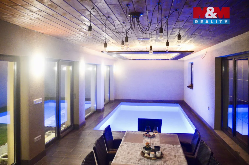 Dominantou domu je velkorysá denní místnost s vnitřním bazénem, která zajišťuje nadstandardní komfort bydlení. Dispozice nabízí vstupní zádveří, technickou místnost, garáž, halu s kuchyňským koutem, obývací pokoj, dva samostatné pokoje, koupelnu a samostatné WC. V podkroví se nachází otevřený obytný prostor a druhá koupelna. Vytápění plynovým kotlem nebo krbem napojeným na ÚT s akumulační nádrží 1 000 l, ovládání i přes mobilní telefon. Dům je napojen na plyn, vodovod a kanalizaci, k dispozici je také vrtaná studna. Pozemek 1 068 m², užitná plocha 228 m².