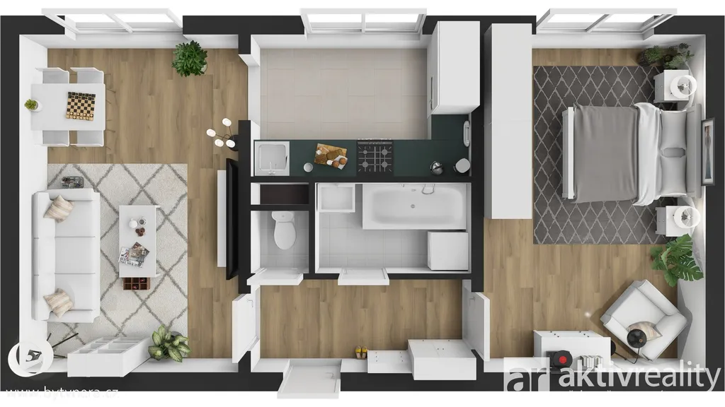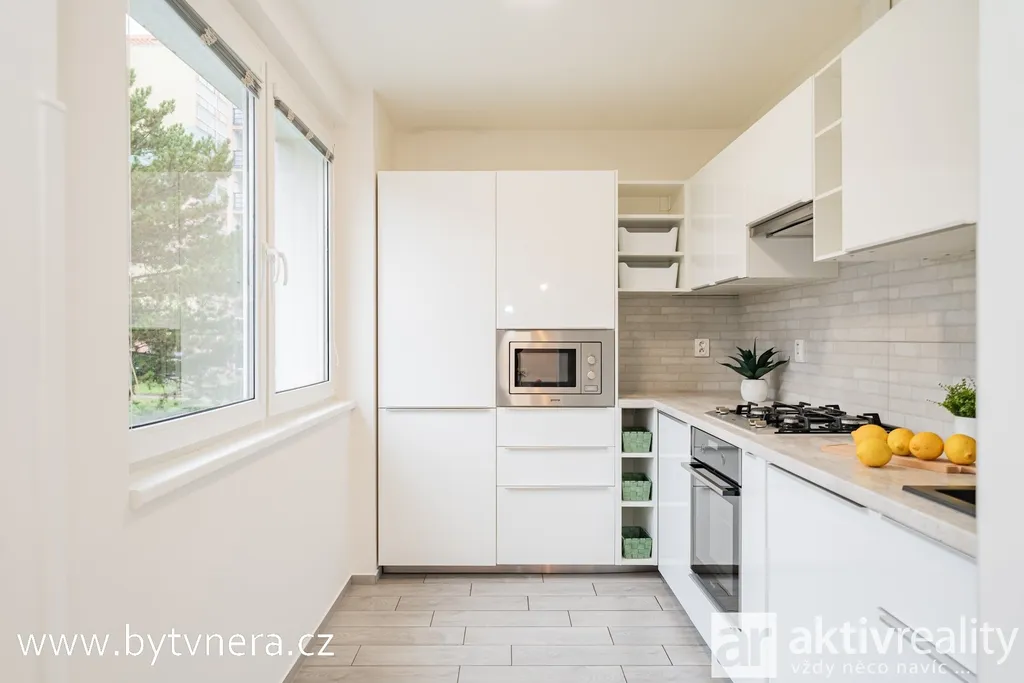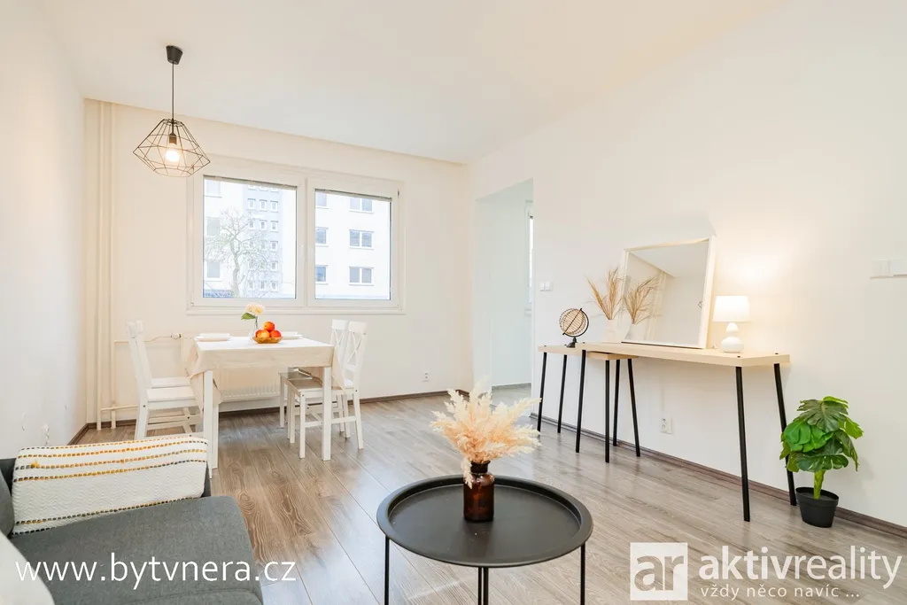 Byt má praktické uspořádání – vstupní chodbu, obývací pokoj propojený s jídelnou a kuchyní vybavenou vestavěnými spotřebiči (plynový sporák Mora, trouba a mikrovlnná trouba Gorenje, lednice), dále prostorný pokoj, samostatné WC a koupelnu s vanou a přípojkou na pračku. Elektřina je v mědi, TV a internet jsou řešeny datovým kabelem. Stropy jsou sníženy sádrokartonem, na oknech jsou rolety a žaluzie.