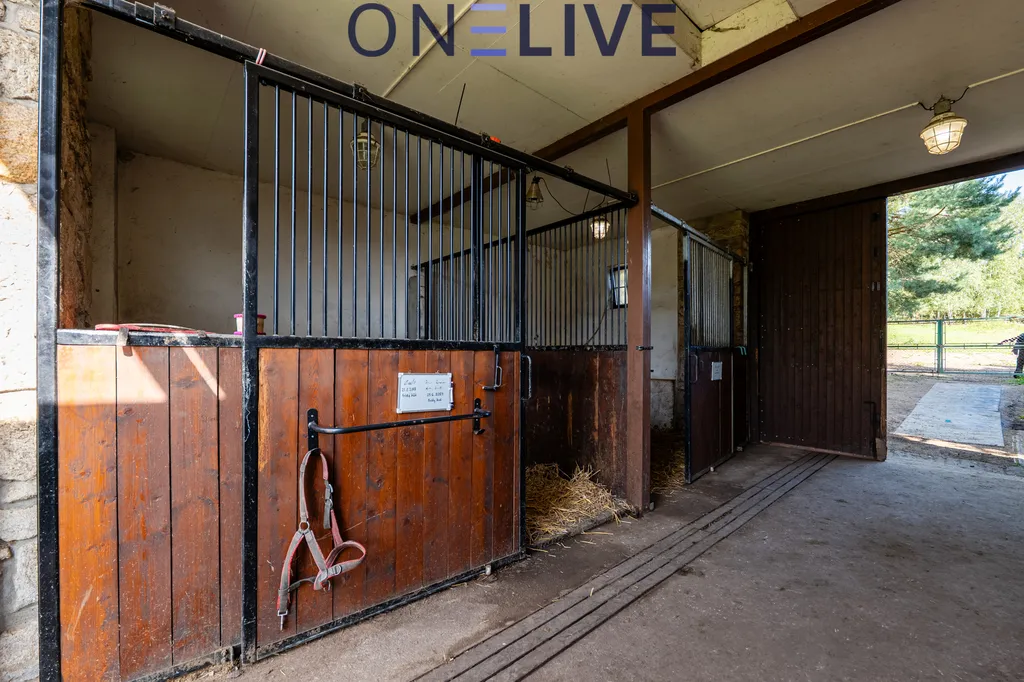 Součástí areálu je druhá budova se stájí — 4 boxy, sedlovna, krmírna a automatické napáječky. Může sloužit pro koně, ale stejně dobře jako dílna, garáže, ateliér či dokonalý pánský klub, kam by – jako na Karlštejn – ženám byl vstup zakázán a tajemství by přikryl dým z kvalitních doutníků.