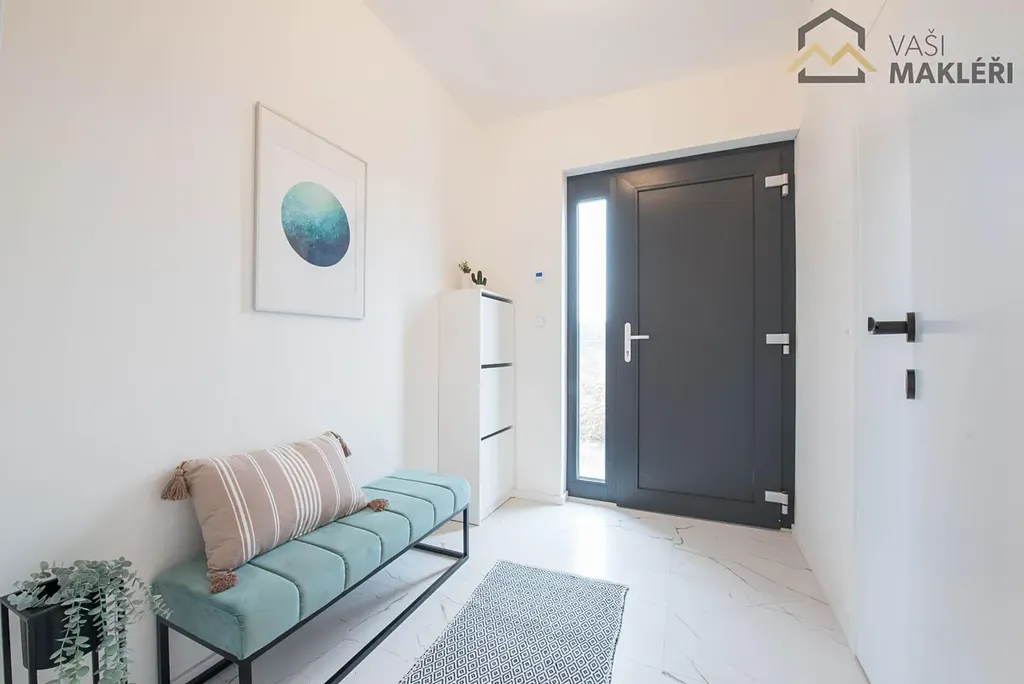 Oblíbenému dispozičnímu řešení 4+kk dominuje prostorný obývací pokoj s francouzskými okny, které propojuje interiér nemovitosti s udržovanou zahradou a také umožňuje vstup na zastřešenou terasu, která je v letních měsících dalším obytným prostorem. Na míru zhotovená kuchyňská linka je plně vybavena vestavěnými spotřebiči a chytře odděluje kuchyňský kout od zbylé části obývacího pokoje. Nemovitost dále disponuje třemi ložnicemi s rozdílnými výměrami. Prostorná koupelna je vybavena sprchovým koutem, dvěma umyvadly a toaletou. Propojovací chodba, zádveří a sklad poskytují dostatek místa pro úložné prostory (pro skladování sezónních věcí lze využít i pochozí prostor na půdě) a druhá toaleta je samozřejmostí. Součástí domu je i technická místnost se samostatným vstupem. V rozložení jednotlivých místností se nejlépe zorientujete z půdorysu, který je součástí inzerátu nebo si dům projděte virtuálně, z pohodlí vašeho domova.