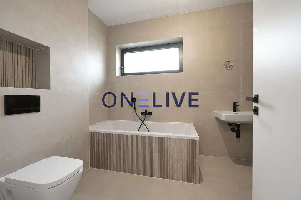 Dominantou domu je světlý obývací pokoj propojený s kuchyní a jídelní částí, odkud je přímý vstup na zahradu. Ze všech obytných místností – ložnice i dvou dětských pokojů – lze vyjít přímo ven, což dodává domu vzdušnost a propojuje interiér s exteriérem. Dále se v domě nachází vstupní chodba, která je prostorná a prakticky řešená, koupelna s vanou, sprchovým koutem a samostatná toaleta. K dispozici je také technická místnost s místem pro pračku a sušičku.