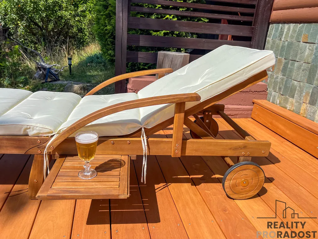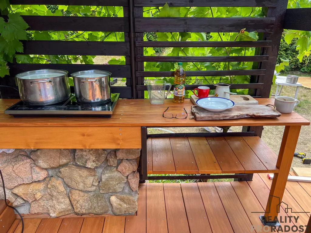 1. LUXUSNÍ ŽIVOT VENKU (Terasa Garapa) Dominantou je zcela nová terasa (dokončeno 06/2025) z prémiového tropického dřeva Garapa s životností desítky let. Součástí je na míru dělaná letní kuchyně. Zde se odehrává život – snídaně na slunci i večerní grilování s výhledem. (Celkový prostor k užívání vč. teras je velkorysých 76 m²).