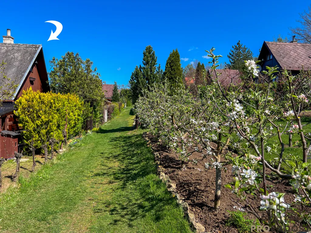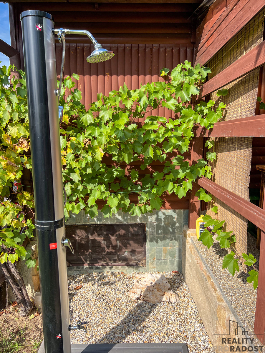 ➥ Voda: Napojeno na sezonní vodovodní řad zahrádkářské osady (jaro–podzim) + vlastní studna s užitkovou vodou (30 m od chaty) jako záloha pro WC či zalévání. Dešťová voda je svedena do nádrže na zalévání.