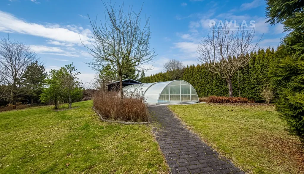 Venkovní prostor je skutečným rájem pro relaxaci i aktivní odpočinek. Dominantou zahrady je bazén se solárním ohřevem, který doplňuje praktické zázemí v podobě krytého stání pro karavan a dílen v suterénu domu. Kombinace obecního vodovodu a vlastní studny zajišťuje ekonomický provoz, zatímco vytápění elektrokotlem v kombinaci s tuhými palivy nabízí nezávislost. Plynová přípojka je vybudována na hranici pozemku. Tento dům není pouhou stavbou, je to místo, kde vzrostlé stromy a pečlivě udržovaný trávník vyprávějí příběh o spokojeném domově, do kterého se bude těšit nastěhovat.
