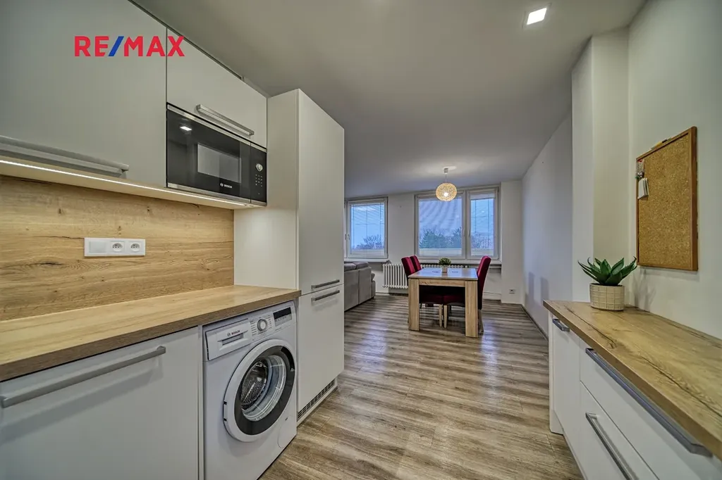 Byt disponuje prostorným obývacím pokojem navazujícím na plně vybavenou kuchyňskou linku s vestavěnou varnou deskou, troubou, digestoří, myčkou a mikrovlnnou troubou. Dále je zde lednice s mrazákem a pračka.