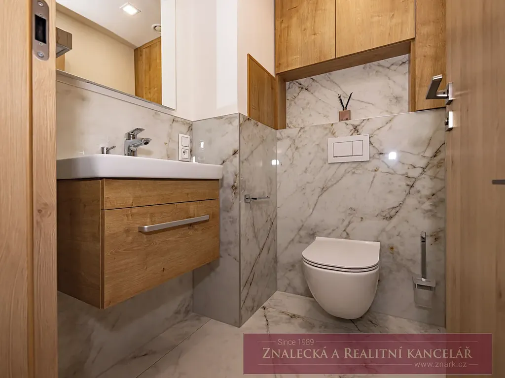Koupelna je skutečným designovým zážitkem – kombinace imitace mramoru- velkoformátové porcelánové dlažby a dubových prvků vytváří harmonii, která působí čistě, elegantně a nadčasově. Samostatné WC je samozřejmostí.