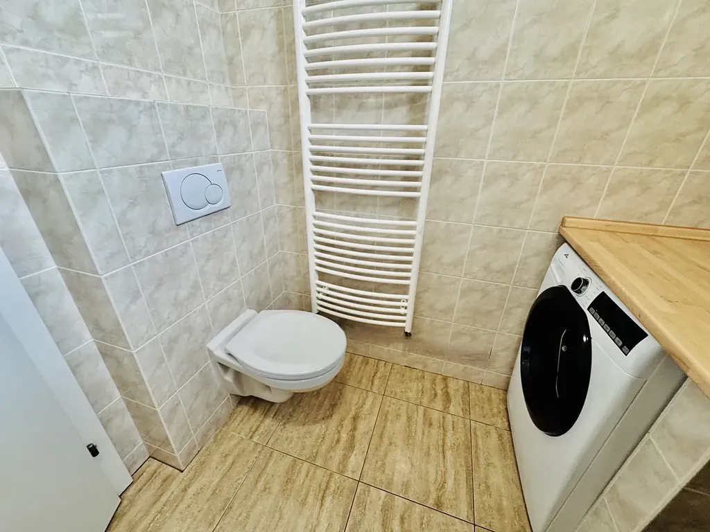 Byt je vybavený novou kuchyňskou linkou na míru s vestavěnými spotřebiči. Myčka, lednice s mrazničkou, indukční varná deska, pečící trouba, mikrovlnná trouba, digestoř.