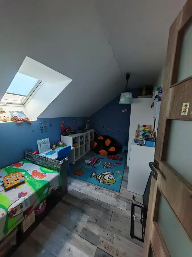 V podkroví se nachází dva dětské pokoje a ložnice se samostatnou šatní místností.