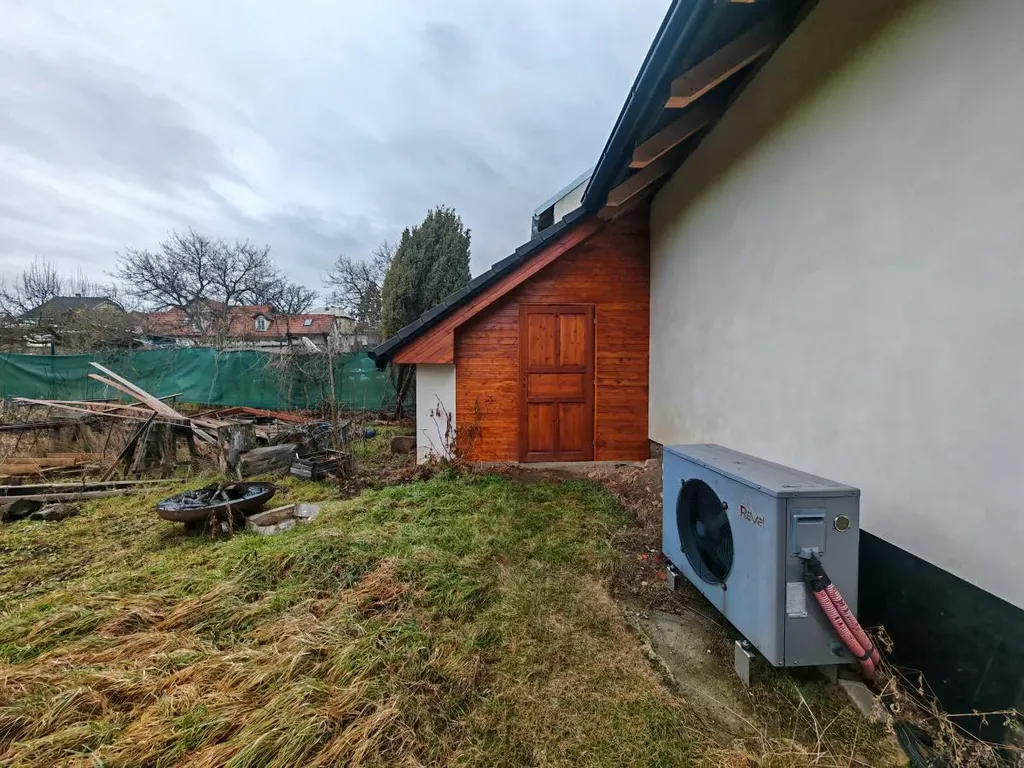 Přízemí domu tvoří prostorný obývací pokoj s krbem a kuchyní, kde je nainstalován posuvný HS portál s výstupem na zahradu, kde se nachází velká krytá dřevěná terasa o velikosti přibližně 45 m². Na terasu je zavedeno elektrické osvětlení a rozvod elektřiny, což zajišťuje její pohodlné venkovní užívání. V přízemí dále naleznete sociální zařízení se sprchou, pracovnu, jídelnu, komoru na potraviny a místnost s technologickým zařízením tepelného čerpadla a podlahového vytápění pro přízemí. Na podlahové vytápění v podkroví je připravena samostatná úprava v chodbě.