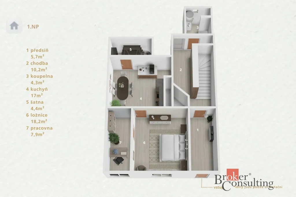 - 2 podlaží + půda – ideální pro rodinu, dvougenerační bydlení nebo kombinaci bydlení a podnikání