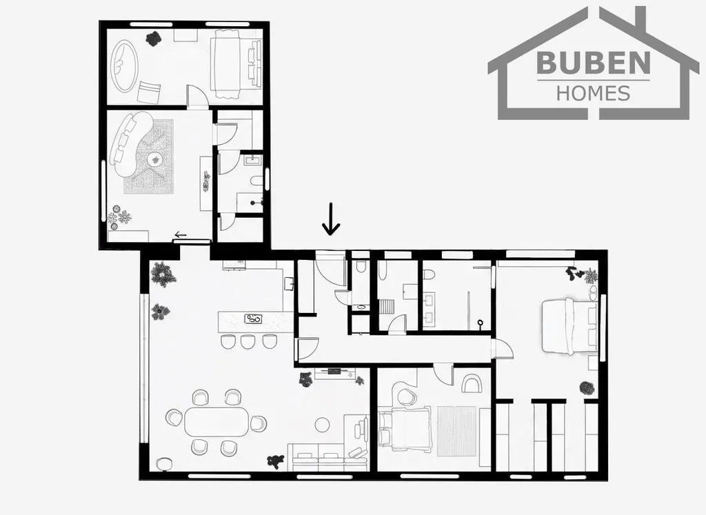 Dům tvoří zádveří s vestavěnou skříní, chodba, samostatné WC, technická místnost, prostorná obývací kuchyň s jídelnou a obývacím pokojem (se vstupem na zastřešenou terasu), 4 ložnice (jedna s přímím vstupem do koupelny s WC + 2x šatna), šatna a koupelna s WC se skladovým prostorem.