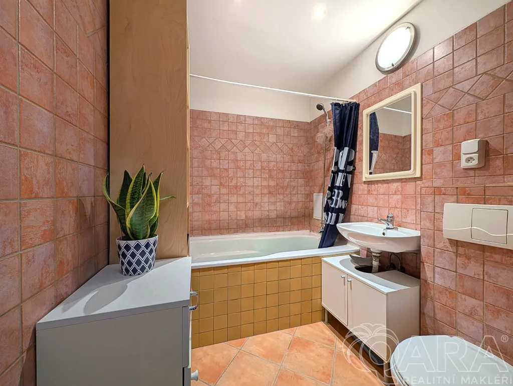 První pokoj je přístupný přes kuchyni (průchozí). Druhý pokoj má samostatný vstup z předsíně. Z předsíně je rovněž vstup do koupelny, která je vybavena vanou, umyvadlem, WC a topným žebříkem. Pračka je umístěna v předsíni. V domě je výtah a byt se nachází na druhém podlaží.