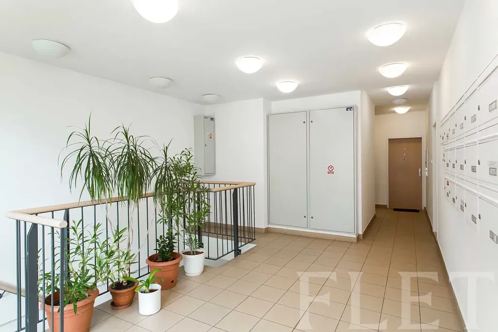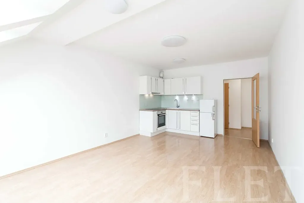 Byt se nachází v moderním bytovém domě (Energetická náročnost budovy: Třída B - Velmi úsporná č. 78/2013 Sb. podle vyhlášky. Ukazatel energetické náročnosti budovy: 77,0 kWh/m^2 za rok) s výtahem a udržovanými společnými prostory. Interiér působí velmi čistě, svěže a vzdušně. Dominantou je prostorný obývací pokoj s kuchyňským koutem, kde díky střešním oknům proudí dostatek denního světla. Kuchyňská linka je v moderním bílém provedení, vybavena vestavnou troubou, varnou deskou, digestoří i lednicí. Neutrální tóny, světlá podlaha a jednoduchý design dávají budoucímu majiteli možnost doladit si interiér podle vlastního stylu.