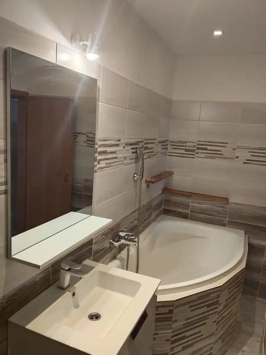Velmi hezká je i koupelna, která disponuje rohovou vanou, prostorem pro pračku i sušičku a koupel. skříňku. Toaleta je samostatná.