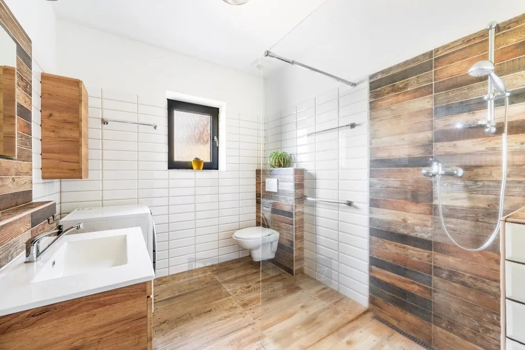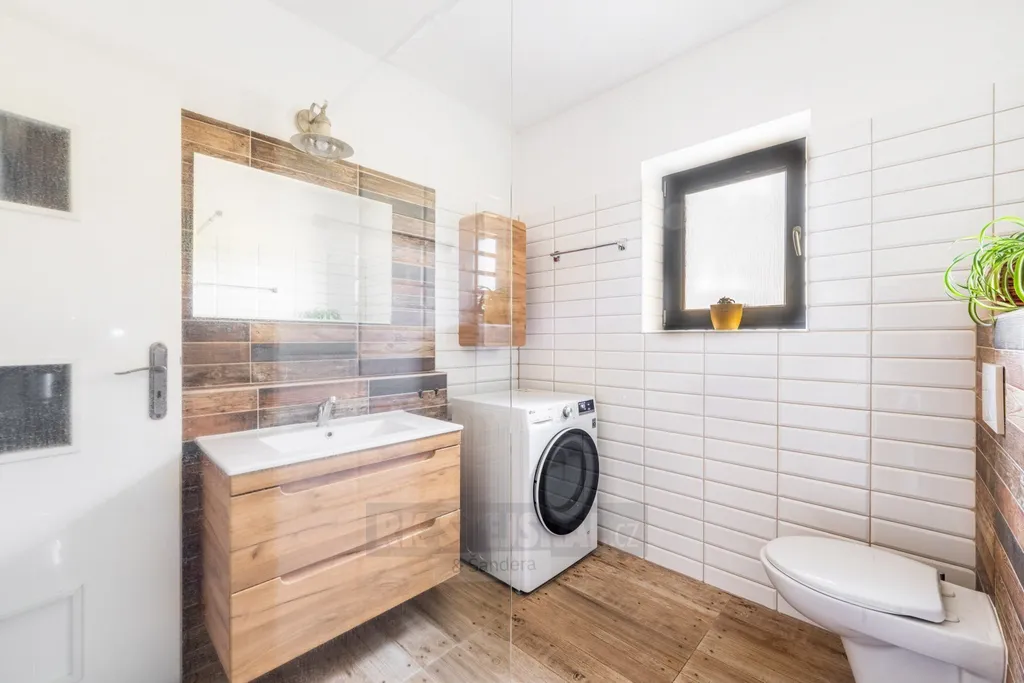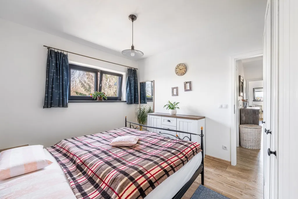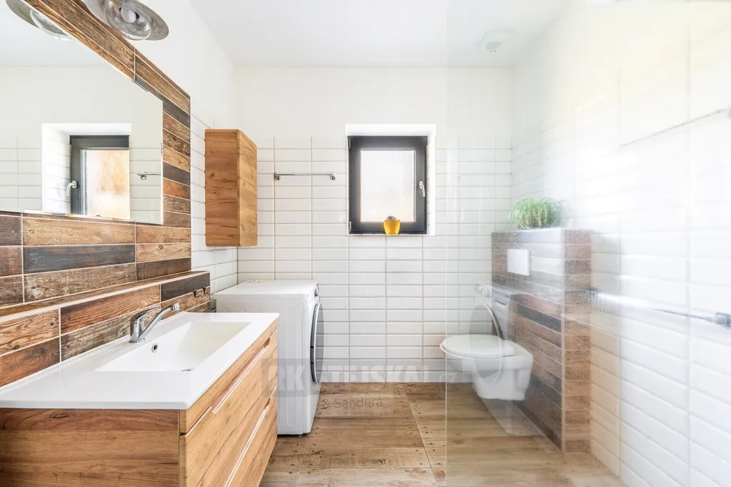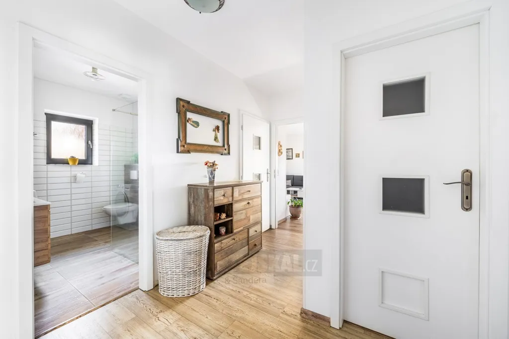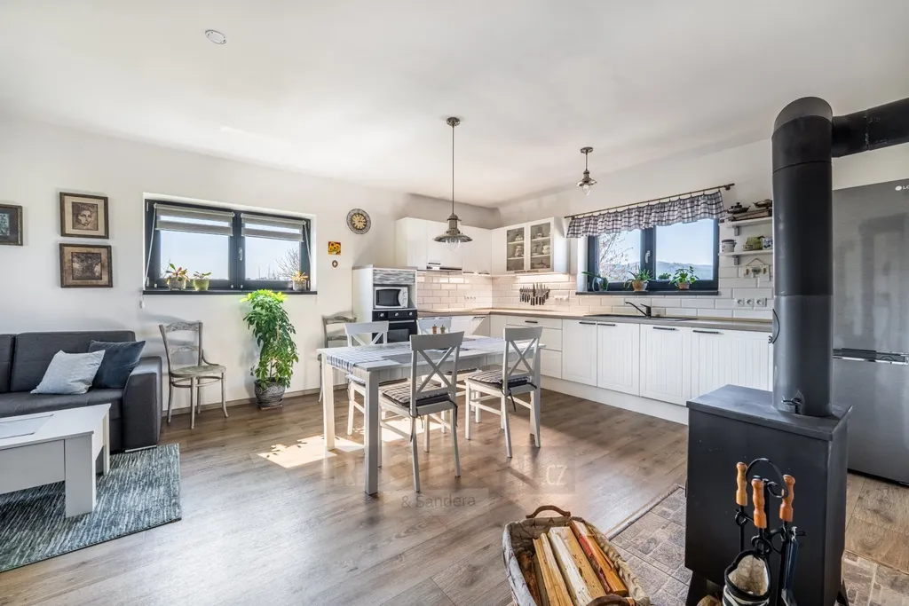 Dispoziční řešení domu je promyšlené a praktické. Z předsíně vstoupíte do chodby, ze které je přístup do dvou samostatných pokojů, koupelny, šatny, odděleného WC a prostorného obývacího pokoje s kuchyňským koutem a samostatnou spíží. Dominantou obytné části jsou krbová kamna, která vytvářejí příjemnou atmosféru a zároveň slouží jako doplňkový zdroj tepla. Z obývacího prostoru je přímý vstup na zastřešenou terasu o velikosti 19 m² s krásným výhledem do okolní krajiny. Část terasy je zasklená a její součástí je venkovní krb, plně vybavená letní kuchyně a také samostatná toaleta přístupná přímo z terasy – ideální řešení při pobytu venku s rodinou či přáteli.