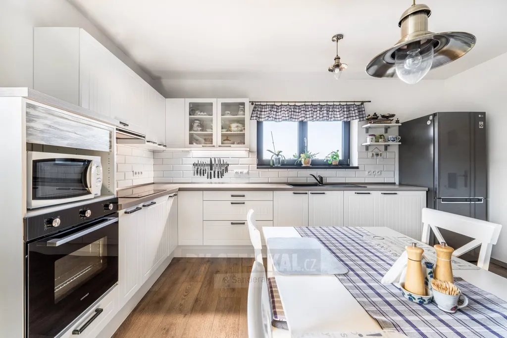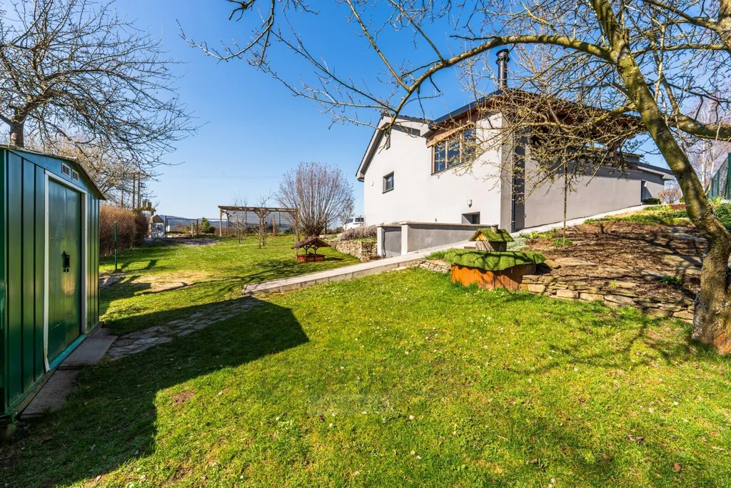 Udržovaná zahrada nabízí skleník, vyvýšené záhony, kompost, ovocné stromky i plechovou konstrukci vhodnou k uskladnění nářadí. Sklep je přístupný z venkovní části domu a je rozdělen na dvě samostatné místnosti sloužící jako praktické skladové prostory. Parkování je možné v garáži nebo pohodlně přímo na vlastním pozemku před domem. Z garáže je zároveň vstup do technické místnosti, kde je umístěn bojler a elektrokotel.