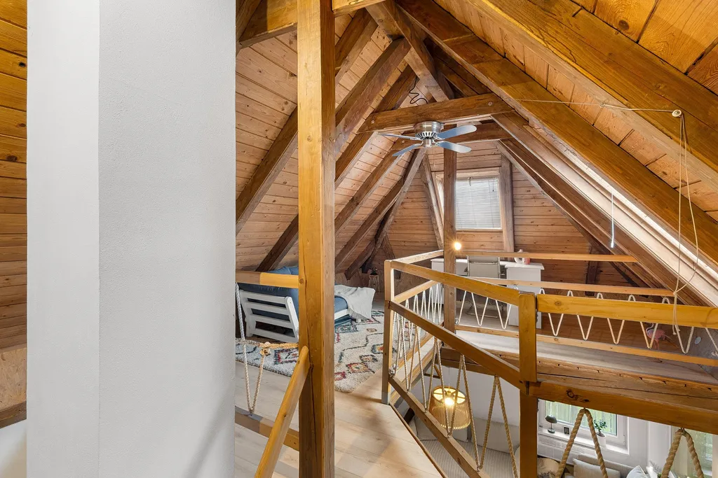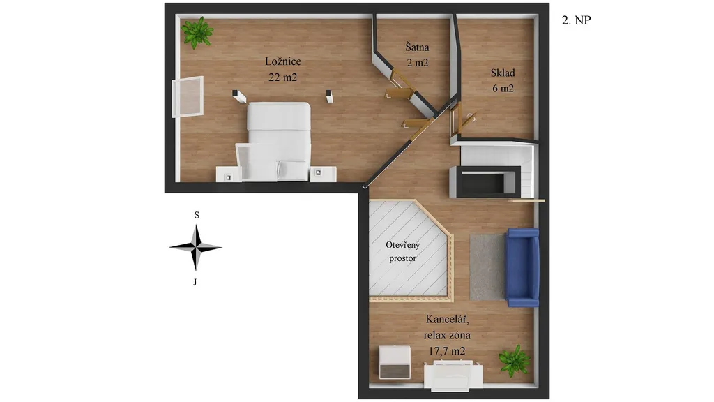Schodiště kolem krbu vás zavede do podkroví, kde se při vstupu otevírá dřevěný prostor vhodný jako pracovna, relaxační zóna nebo místo pro klidné posezení. Navazuje na něj samostatný prostorný pokoj s menší šatnou a dalším praktickým úložným prostorem.