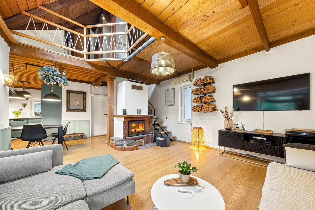 Dům nepůsobí jako typová stavba, ale jako místo s vlastním charakterem. Otevřené dřevěné patro, krb jako přirozený střed obytného prostoru a celková vzdušnost interiéru vytvářejí příjemné a klidné prostředí. Je to dům, kde má každý prostor svůj smysl.