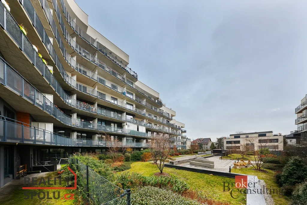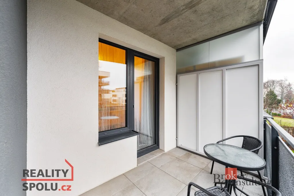 K bytu náleží lodžie (11 m²), jež je přístupná z obou hlavních místností, sklepní kóje (3 m²) a parkovací stání v podzemní garáži.