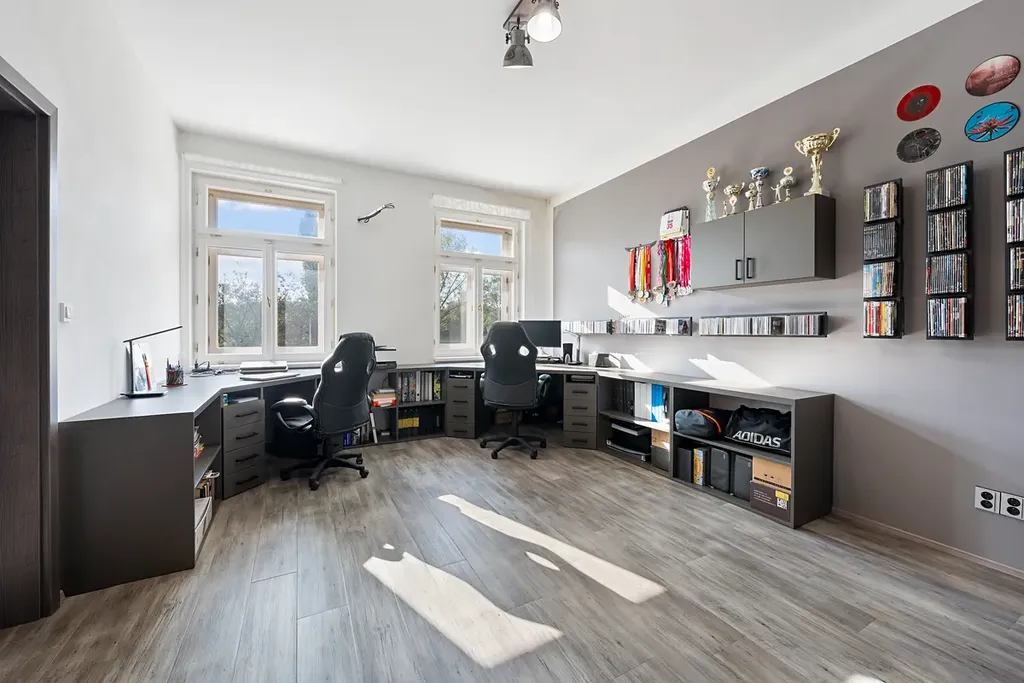 Nemovitost je rozdělena prohlášením vlastníka na čtyři bytové jednotky a dva nebytové prostory, což otevírá široké možnosti využití – od vícegeneračního bydlení přes reprezentativní sídlo až po stabilní investici s výnosovým potenciálem.