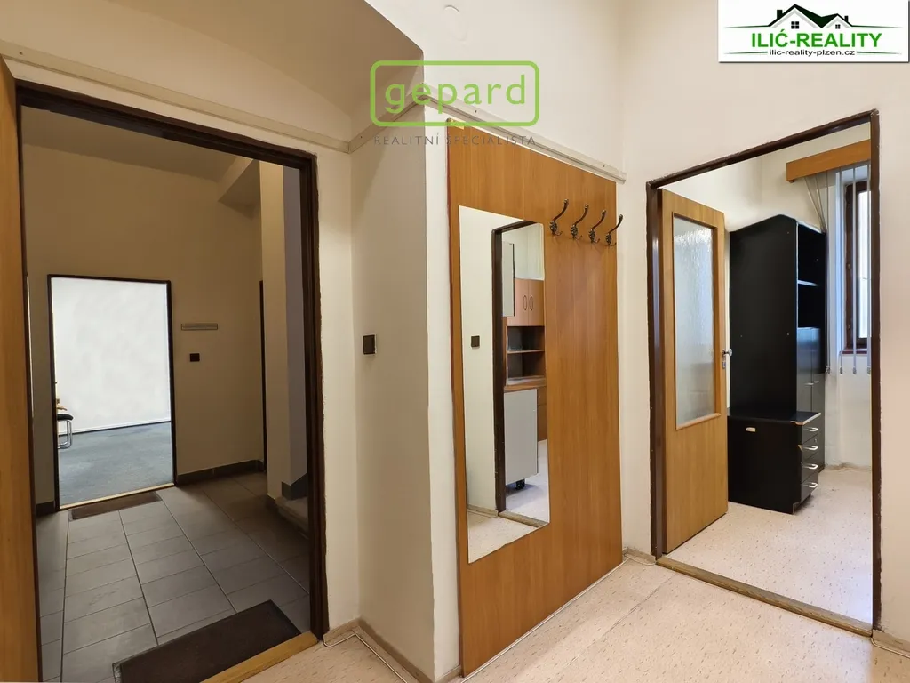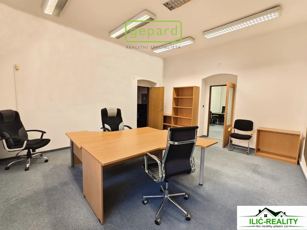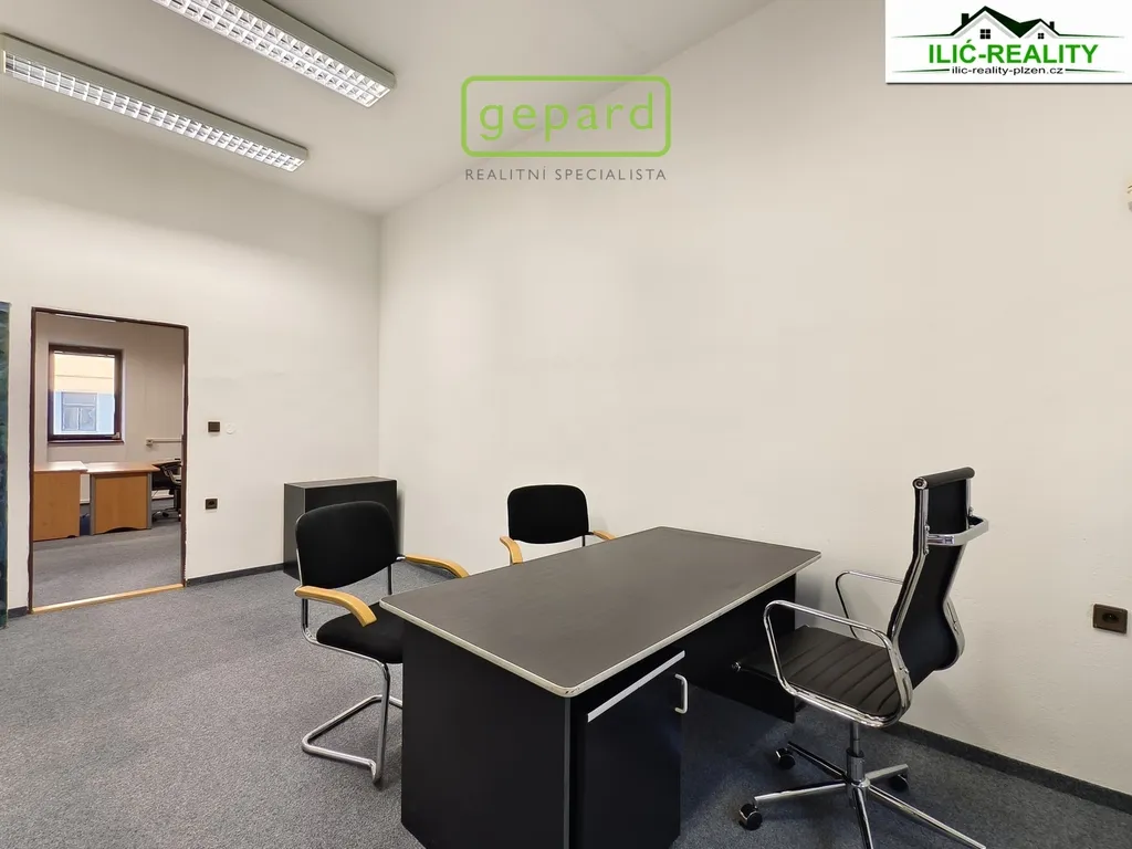 Nabízíme k pronájmu dvě zařízené kanceláře o velikosti 18 m² a 27 m² v prvním patře administrativní budovy na Roudné v Plzni.