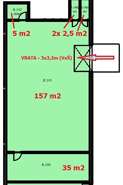 ◉ 202 m2 – nově připravovaný a stavebně upravený skladově výrobní prostor – 2x místnost, samostatný, zděný, vlastní vjezdová vrata 3x3,2m, 2x WC, příprava na kuchyňku, vlastní zpevněný vjezd do prostor, možné jeho variabilní využití.