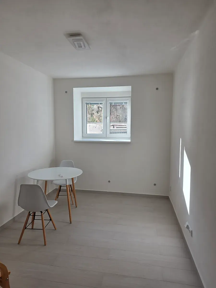 Byt se nachází v suterénu klidného činžovního domu. Sestává z chodby/kuchně 10,8 m2, pokoj 10 m2, koupelny a WC 3,4 m2. Je nově zrekonstruován, bez vlhkosti (byla provedena hydroizolace domu). V bytu jsou plastová okna s izolačními trojskly, byt je vytápěn podlahovým topením. V průběhu léta není třeba klimatizace a teplo v zimě zajišťuje podlahové vytápění. Před okny je uzavřená zahrada, kam má přístup jen správce a kam není jiný vchod než přes dům.