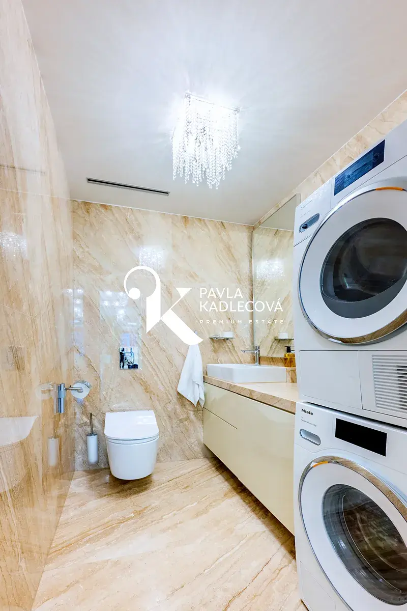 Praktickým prvkem bytu je samostatná toaleta pro hosty s integrovanou prádelnou a dále samostatná komora poskytující dostatek úložného prostoru.