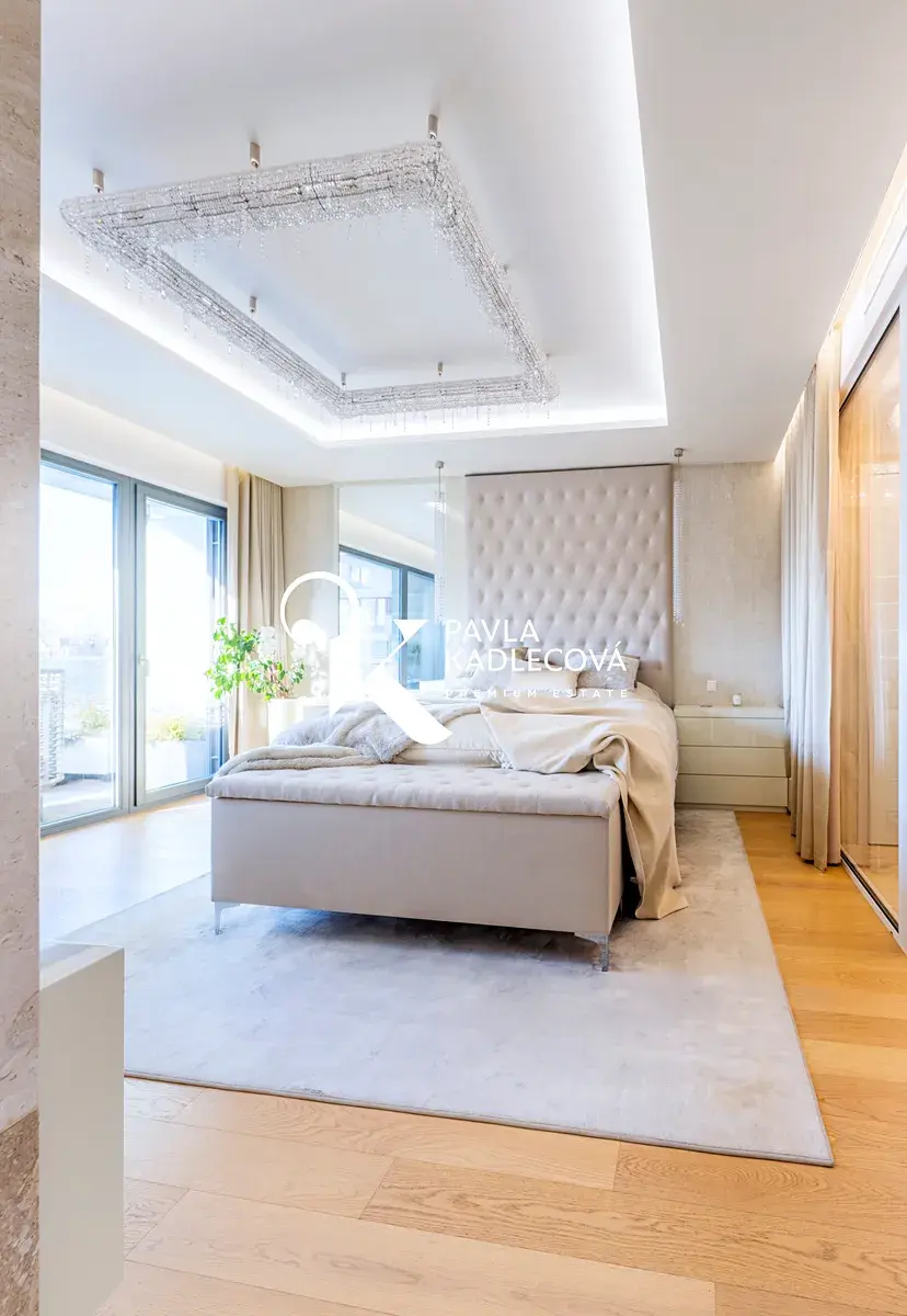 Hlavní ložnice nabízí naprosté soukromí a komfort. Prosklená stěna s přímým vstupem na terasu propojuje interiér s exteriérem a vytváří klidné místo pro odpočinek. Součástí ložnice je prostorná šatna a vlastní koupelna řešená ve spa stylu, s velkoformátovým mramorem, podsvícenou dešťovou sprchou, umyvadlem a separátní toaletou (inteligentní japonská toaleta značky TOTO). Vše je navrženo tak, aby podporovalo pocit klidu a pohody.