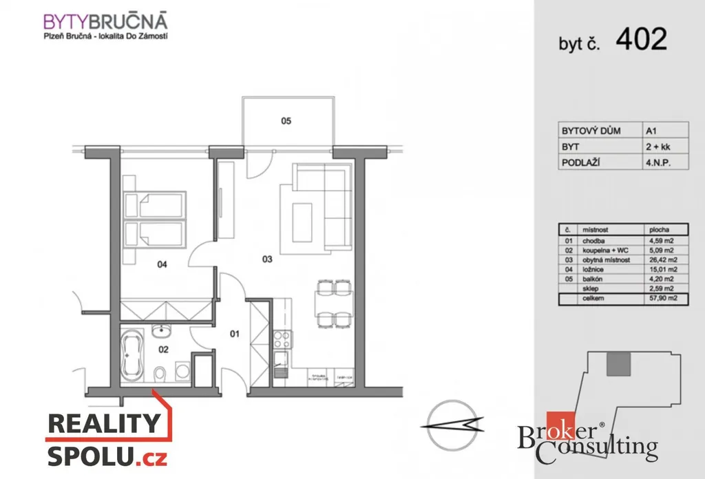 Na pronájem nadstandardně vybavený byt 2+kk s balkonem ve třetím patře moderního bytového domu v Plzni na Bručné. Byt je vybaven kuchyňskou linkou s vestavěnými spotřebiči vč. lednice a myčky nádobí, vestavěnými skříněmi na předsíni i v ložnici a má elektrické předokenní žaluzie. V koupelně je velký sprchový kout a WC. Vytápění zajišťuje moderní plynová kotelna v suterénu domu. Nespornou výhodou je praktická komora (sklep) přímo na patře. Součástí pronájmu je také kryté parkovací stání v suterénu domu.