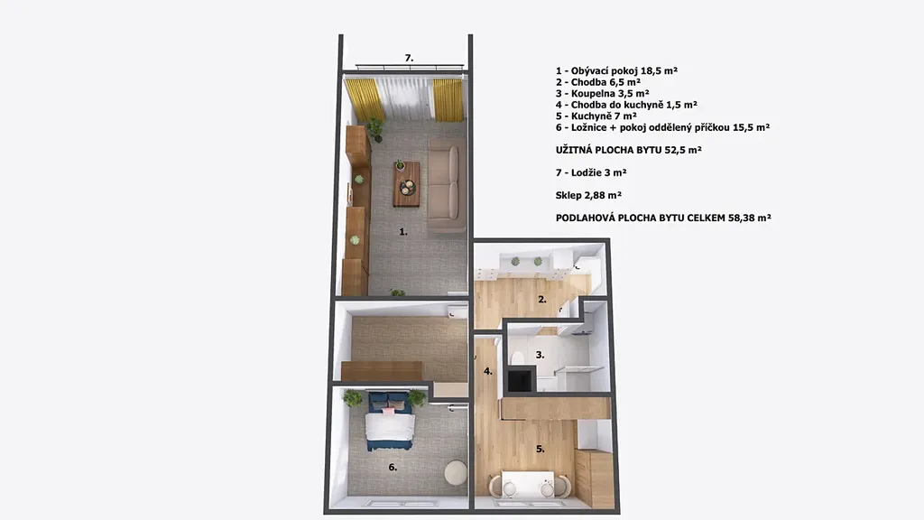 Užitná plocha bytu je 52,5 m² a k bytu patří lodžie (3 m²) a sklepní kóje (2,88 m²), kde si můžete pohodlně uschovat sezónní věci. Celková podlahová plocha je tak 58,38 m².
