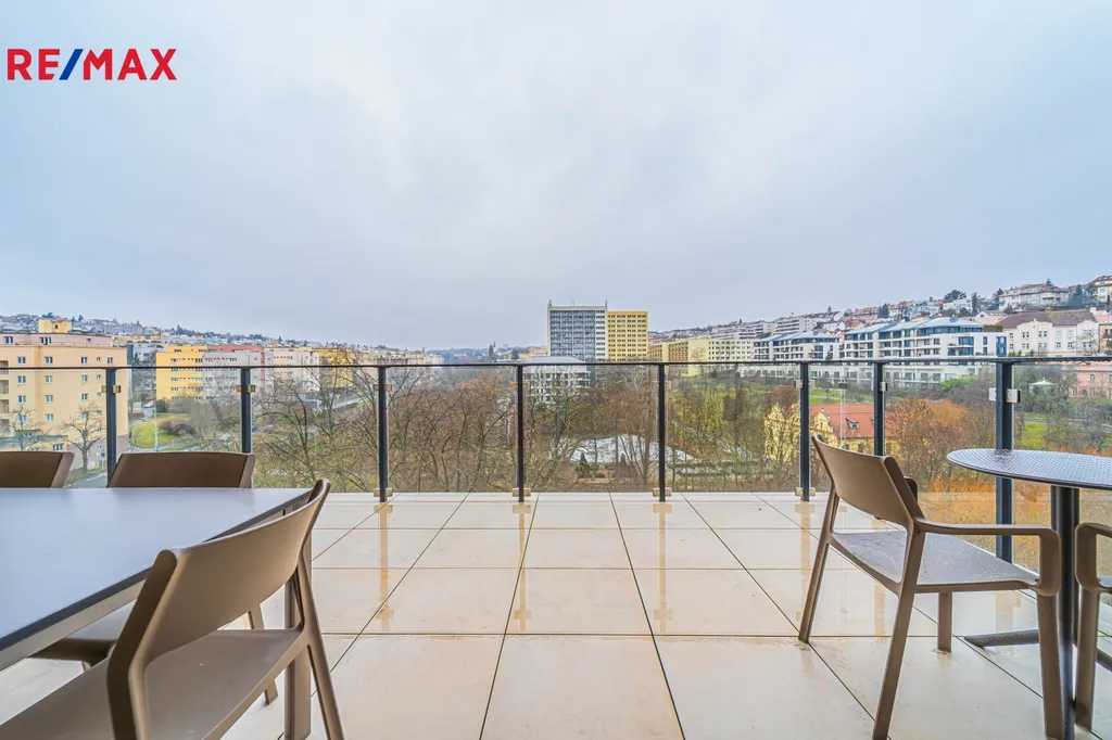 Z obývacího pokoje i ložnice je přes panoramatická posuvná okna přímý vstup na terasu o ploše cca 24 m² (7 × 3,5 m), která nabízí nádherný výhled na park Kajetánka, vilu Kajetánka, budovu oranžerie a také na osvětlené areály Břevnovského a Strahovského kláštera.