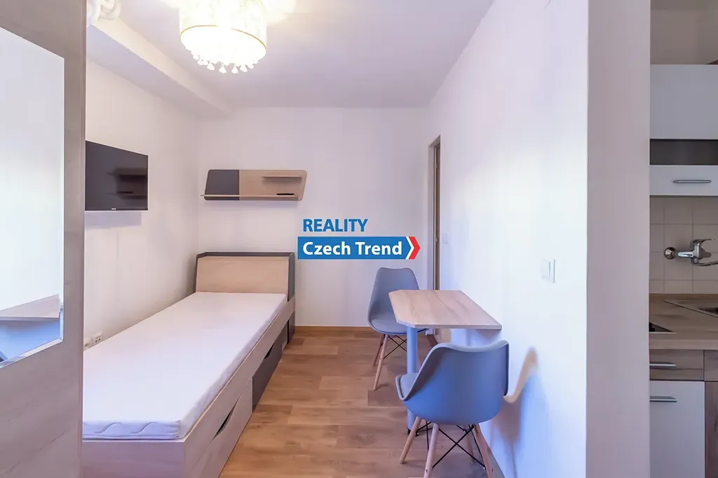 Byt se pronajímá zařízený a vybavený – viz. fotodokumentace (kuchyňská linka, postel s úložnými prostory, šatní skříň, police, stůl + 2 židle, televizor, lednice).