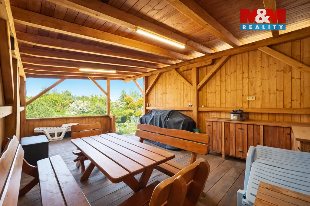 Zahrada je pečlivě udržovaná. Na pozemku je také dřevěná pergola, ideální k posezení s rodinou nebo přáteli. Ať už si chcete vychutnat kávu na čerstvém vzduchu, ugrilovat něco dobrého nebo si jen tak číst knížku, pergola vám poskytne příjemné útočiště.