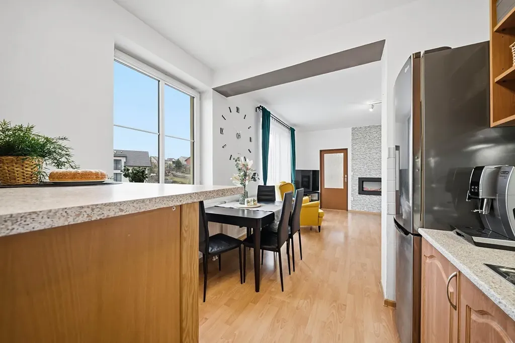 Kuchyňská linka je vybavena lednicí, myčkou, plynovou varnou deskou, digestoří a troubou. K bytu náleží sklepní kóje.
