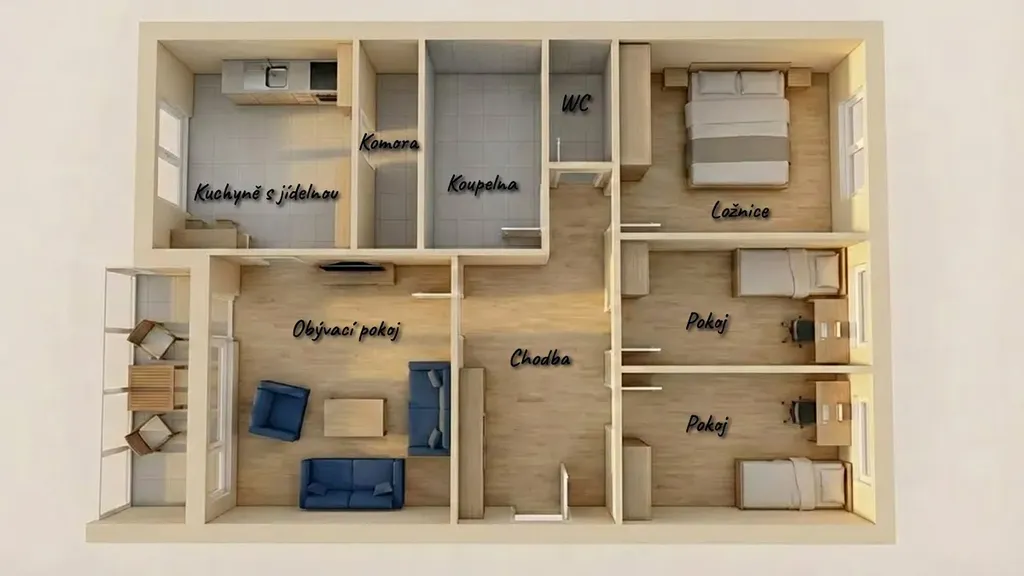 Byt disponuje praktickou dispozicí 4+1, kterou tvoří tři samostatné obytné pokoje, prostorný obývací pokoj, samostatná kuchyně s velkým benefitem – komorou na potraviny, dále koupelna s rohovou vanou, kde je dostatek místa pro pračku i sušičku, a samostatné WC. K bytu náleží také prosklená balkónová lodžie, která poskytuje příjemný prostor k posezení, a sklepní kóje v suterénu domu.