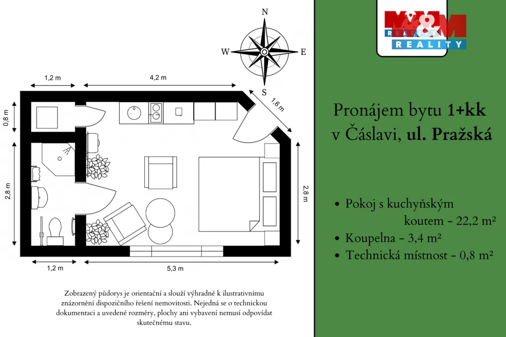 Nabízíme k dlouhodobému pronájmu světlý byt 1+kk o užitné ploše 26,4 m² v klidné části Čáslav ‑ Nové Město. Byt je ve velmi dobrém stavu a nabízí jednu prostornou místnost s kuchyňským koutem a vlastní koupelnu se sprchovým koutem, což představuje příjemné bydlení pro jednotlivce či pár. Jednotka je vybavená, tudíž nebrání nic okamžitému užívání. Díky své poloze máte na dosah obchody, restaurace i kulturní vyžití. Vynikající dopravní dostupnost zajišťuje blízkost veřejné dopravy. K nájemnému je třeba přičíst 4.000 Kč měsíčně na vodné - stočné, internet, elektřinu, vytápění a další služby. Kauce se skládá ve výši 16.000 Kč, odměna zprostředkovateli činí 14.520 Kč včetně DPH. Pokud Vás tato nabídka zaujala neváhejte se na nás obrátit a sjednat si prohlídku.