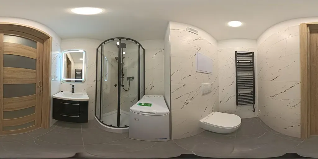 Kuchyňský kout je vybaven lednicí, myčkou nádobí, troubou a varnou deskou.