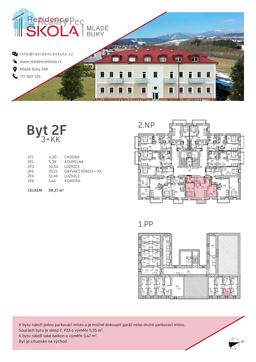 Exkluzivně nabízíme prodej bytu 3+kk s užitnou plochou 59,37 m2 byt se nachází v moderním rezidenčním projektu v centru obce Mladé Buky. Nově zrekonstruovaná budova "staré školy" se přeměnila na bytový dům s 28 byty. Dům s výtahem zajišťuje pohodlné bydlení pro všechny věkové skupiny. Díky kvalitnímu provedení a nízkým nákladům na provoz nabízí ideální podmínky pro každodenní život. Byt je navržen s důrazem na komfort a funkčnost. Byt se nachází ve 2.NP s balkónem orientovaným na východ a výhledem, parkovací stání a sklep jsou samozřejmostí. Nabízí se i možnost dokoupení garáže.
