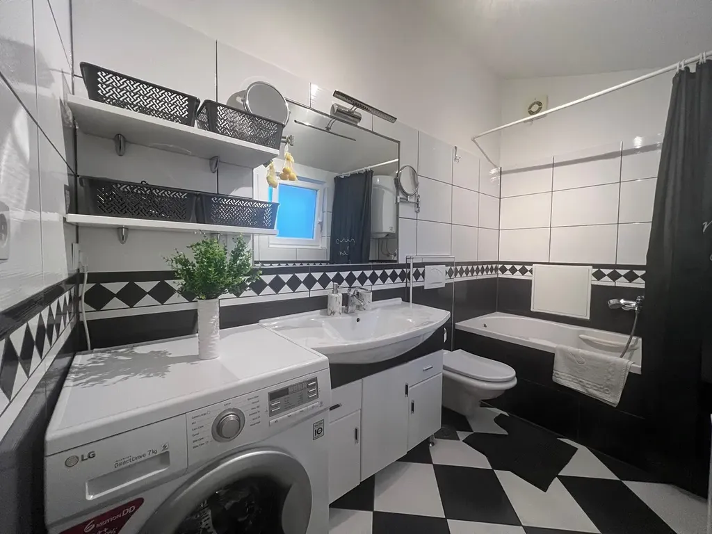 ✔ moderní koupelna v černo-bílé kombinaci s vanou a pračkou