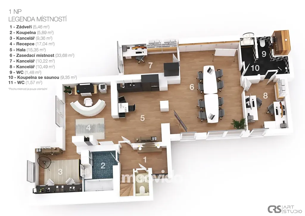 V přízemí o výměře 118 m² se nachází velký reprezentativní prostor (33 m²) se vstupem na terasu, vhodný jako open space kancelář nebo prostorná recepce. Dále je zde kuchyňský kout (15,35 m²), samostatná kancelář (26,39 m²) se vstupem na terasu a dvě další samostatné kanceláře (10,22 m² a 10,49 m²). Jsou zde dvě koupelny, jedna s WC a dále samostatné WC.