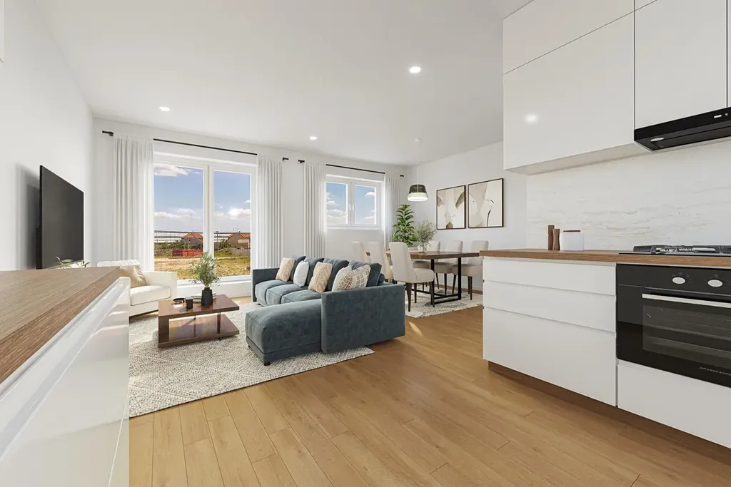 V 1. nadzemní podlaží se nachází samostatná toaleta, technická místnost (vnitřní jednotka TČ, pračka, sušička) a obývací pokoj s kuchyňským koutem (41,9 m2, jihovýchod), který poskytuje přímý vstup na terasu.